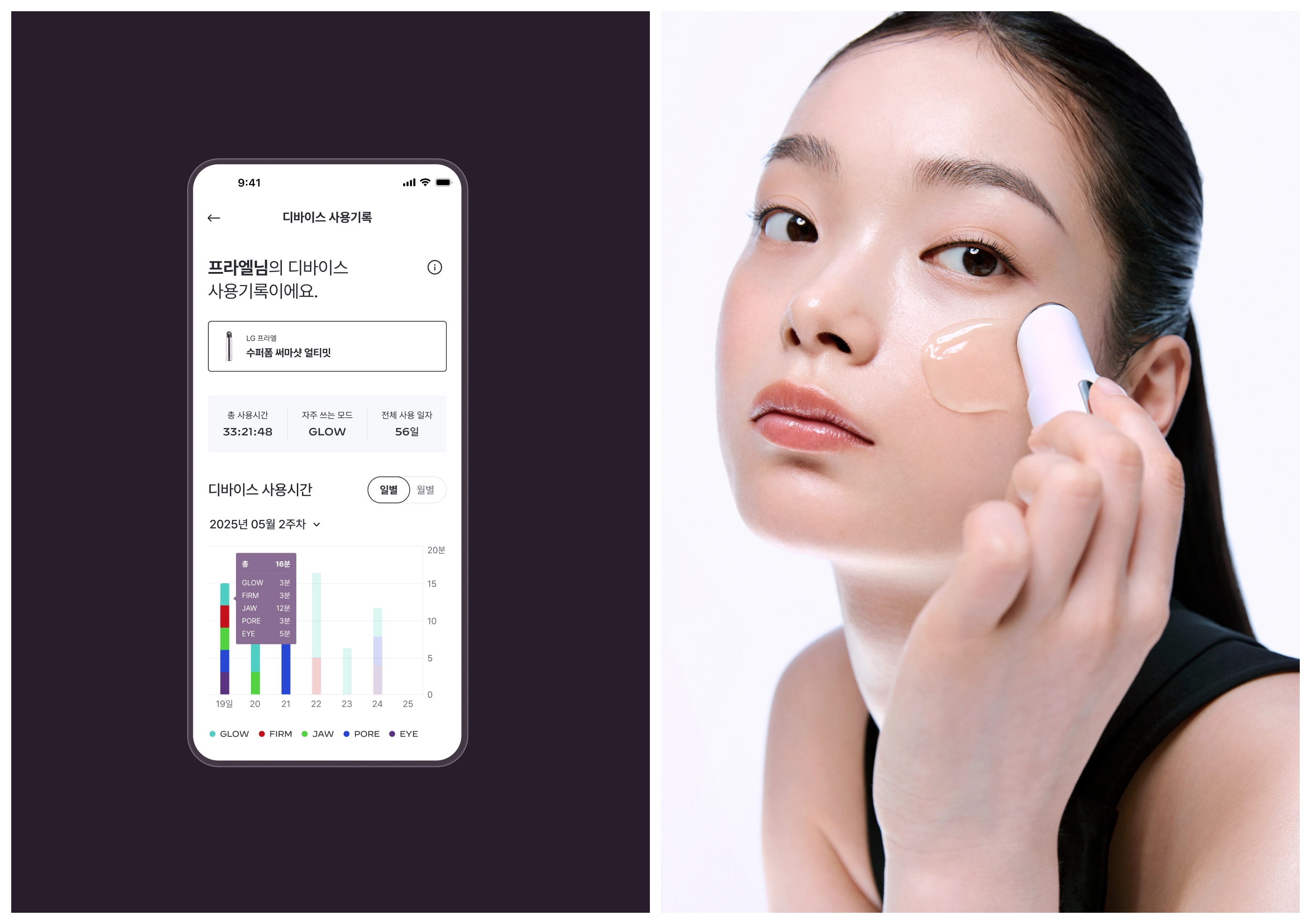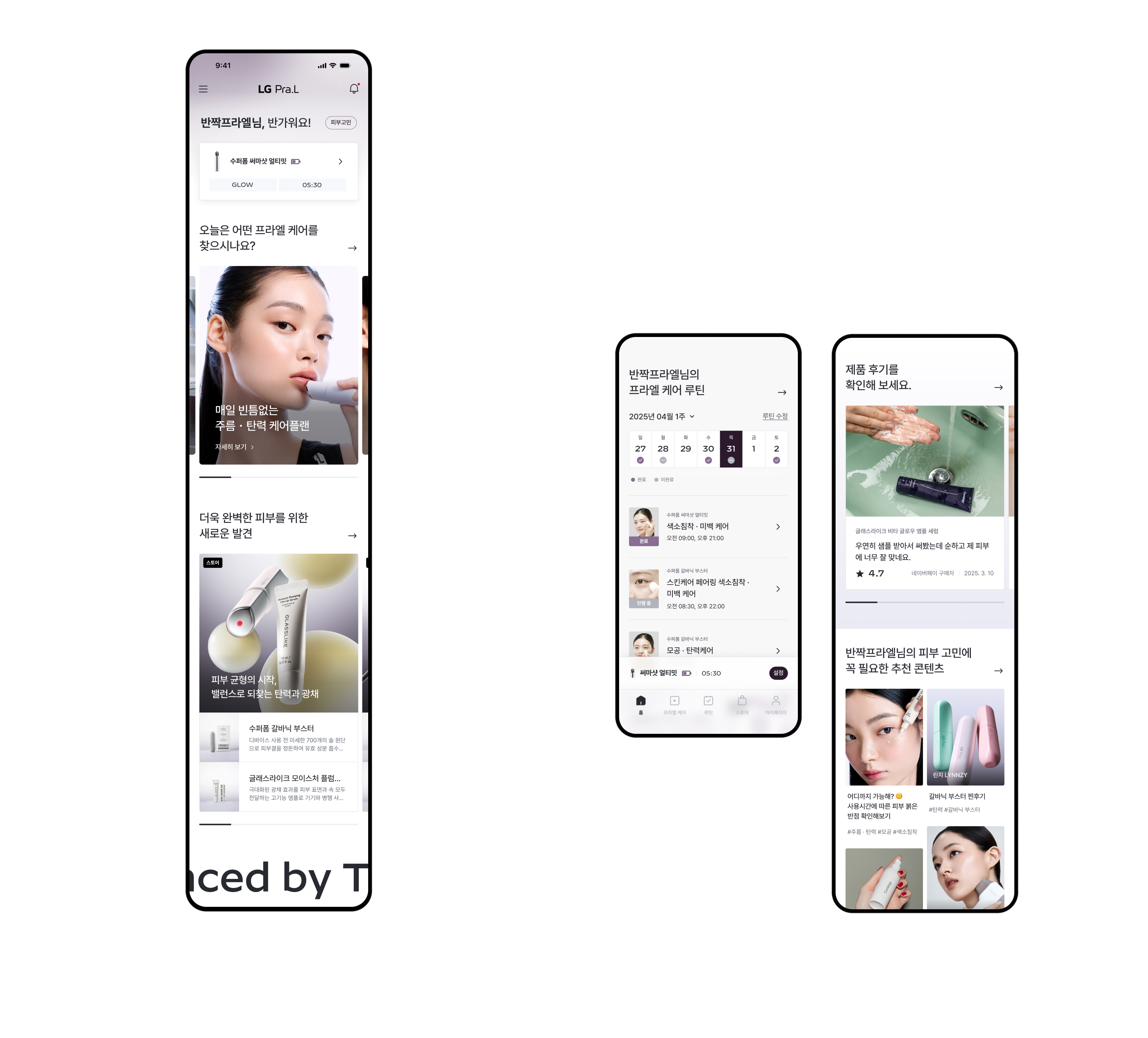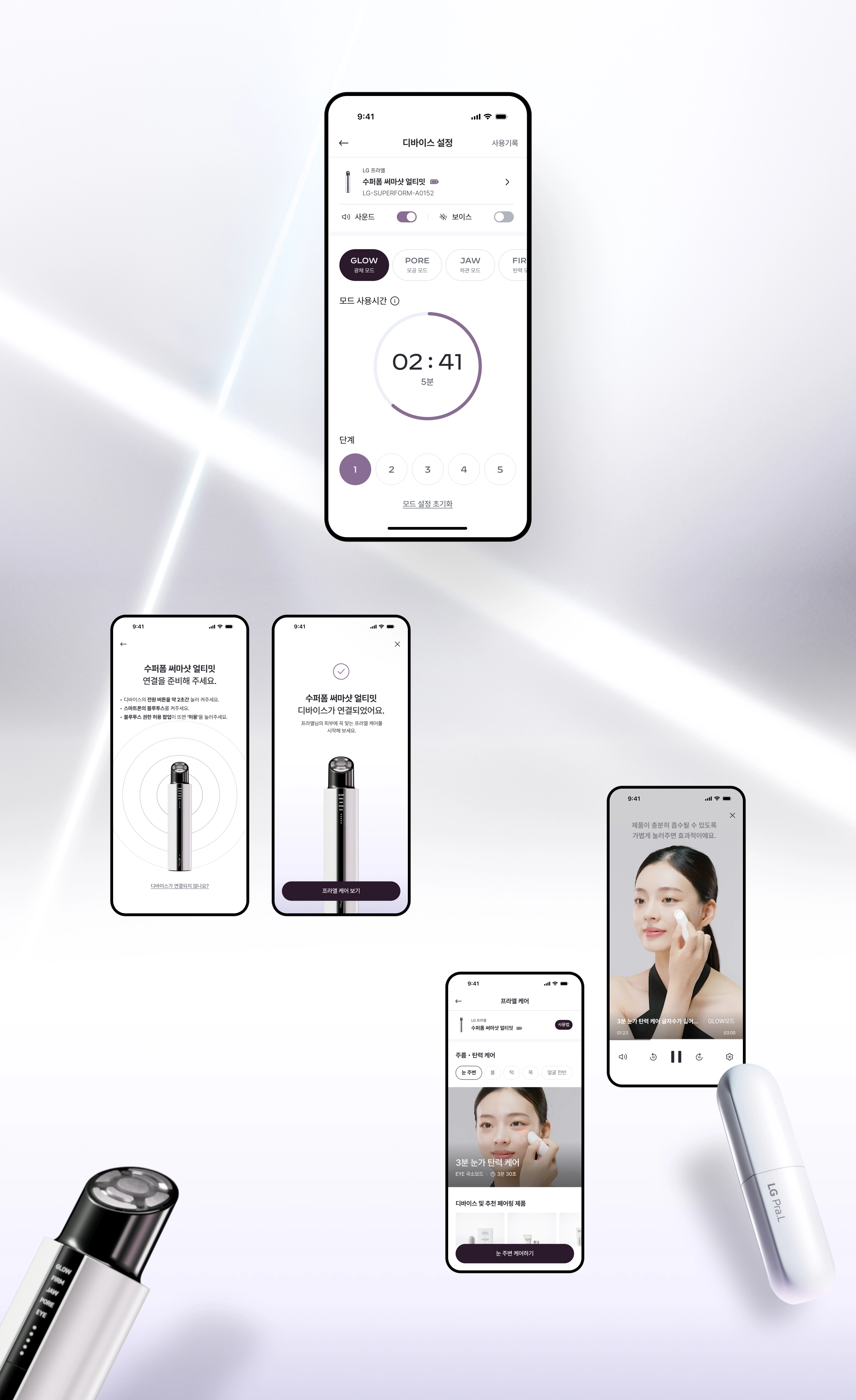 In alignment with LG Pra.L’s brand renewal, we planned and designed a Smart Beauty Solution that seamlessly connects with high-tech beauty devices. By embodying the brand philosophy of "Beauty advanced by tech," we established a sophisticated and trustworthy visual system. Through data-driven hyper-personalized UX, the platform suggests customized routines and content optimized for individual skin concerns. Notably, we maximized usability by streamlining complex device pairing and control processes into an intuitive controller interface, realizing a seamless connection between hardware and digital environments.